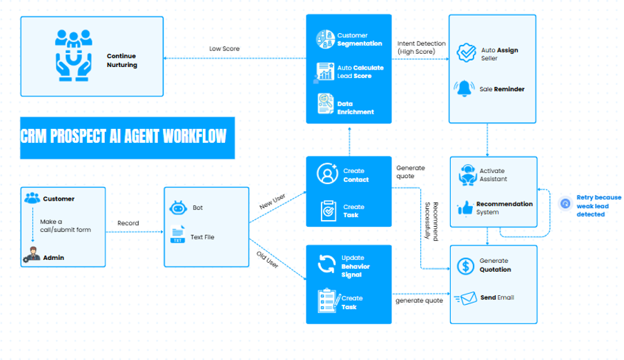 The CRM Prospect AI Agent is an intelligent solution that automates and enhances customer relationship management, from lead creation to engagement, scoring, and retention. Instead of relying solely on manual effort, the system enables businesses to identify lead potential, anticipate customer needs, and ensure every opportunity is followed up at the right moment. With real-time data processing, the CRM Prospect AI Agent allows sales teams to focus on closing deals, reduce time wasted on low-value prospects, and significantly improve overall conversion performance.