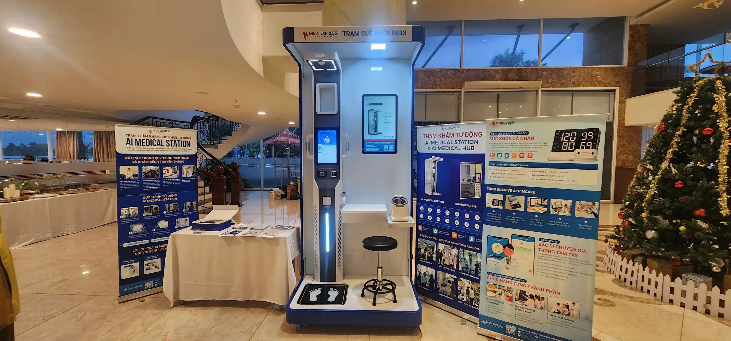 The Health Kiosk has been put into use at several hospitals (Hospital 199, Vinh Long Hospital), exhibitions, events (Da Nang Medical Expo, “Glory of the Vietnam People's Public Security” event), and pharmacies (Medipharma). This solution assists people in quickly and autonomously measuring basic indicators like height, weight, blood pressure, heart rate, and SpO₂... before seeing a doctor.