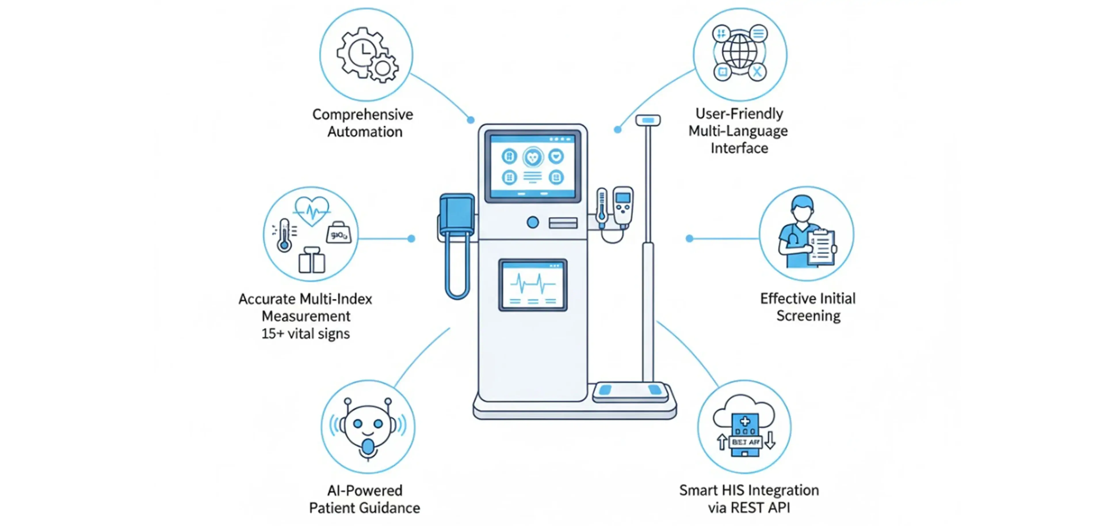 The application of the health check kiosk enables effective initial screening, reduces the workload for medical staff, and increases the public's proactiveness. The product's integration with a hospital's HIS system contributes to a smart medical examination process and enhances the quality of healthcare services and remote consultation services.