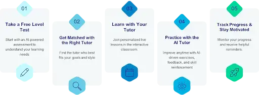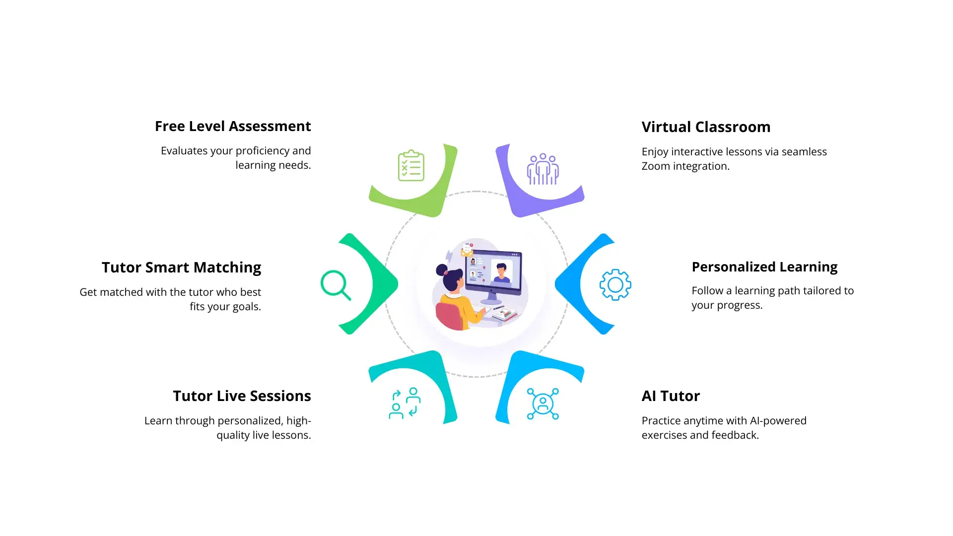 Connect learners with the best tutors and enhance every learning experience with AI-powered personalization in an all-in-one platform. The solution supports the full learning journey by combining expert tutoring, smart matching, interactive virtual classrooms, and continuous practice with an AI Tutor—creating an adaptive and engaging environment for language learning, academics, and skill development.