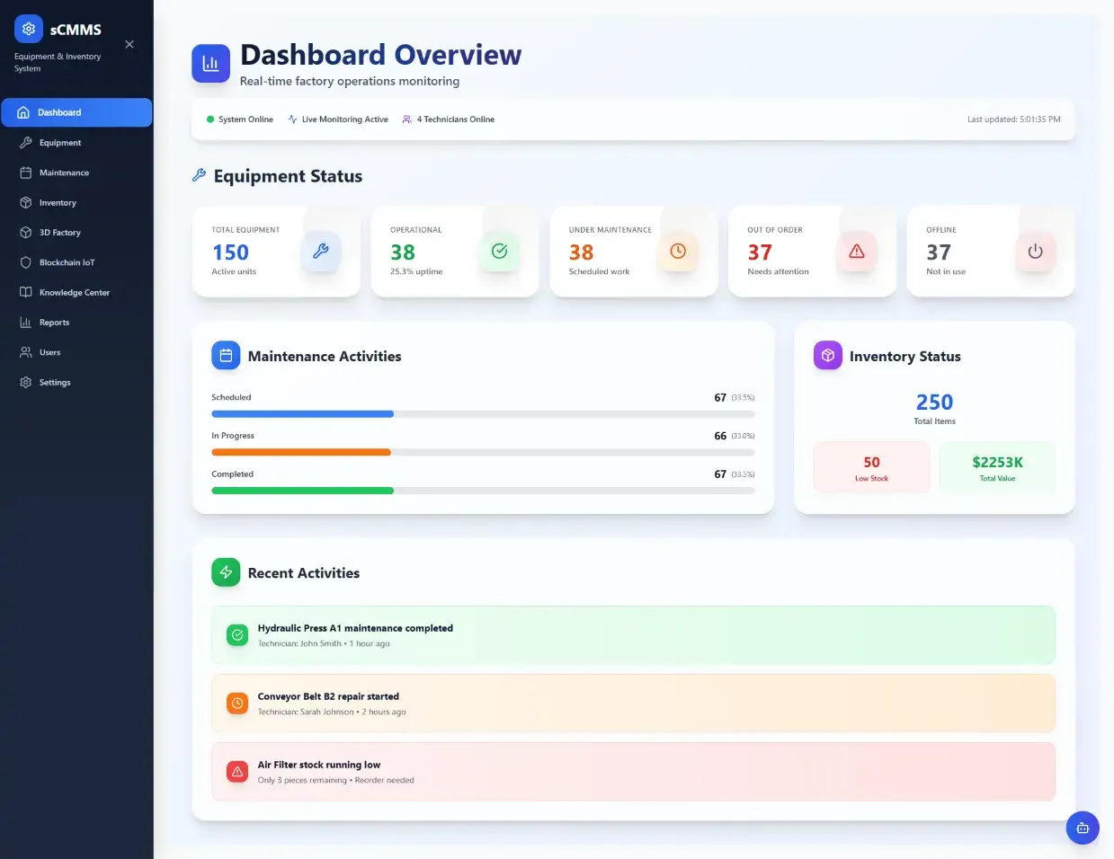 Shift from a reactive to a proactive strategy by scheduling maintenance based on real-world data and pre-set intervals. The system manages the entire lifecycle of equipment and prevents production halts with automated low-stock alerts.