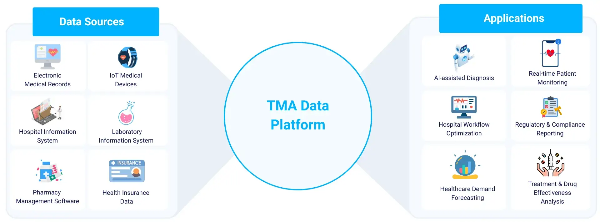 TMA Data Platform unifies data from EMRs, IoT devices, and insurance records to provide actionable insights. It powers applications for AI-assisted diagnosis, real-time patient monitoring, and predictive demand forecasting, ultimately enhancing patient outcomes and ensuring compliance.